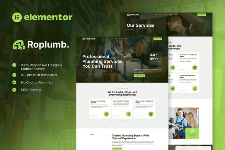 En el oficio de la fontanería, la urgencia es la norma. Cuando una tubería se rompe o hay una fuga, el cliente busca una solución inmediata en su teléfono. Si tu sitio web tarda en cargar, se ve antiguo o no muestra claramente tu número de contacto, perderás ese trabajo frente a la competencia. Roplumb – Plumbing Service Elementor Template Kit es la herramienta de construcción web diseñada específicamente para que plomeros, empresas de mantenimiento y especialistas en reparaciones proyecten la fiabilidad y rapidez que sus clientes necesitan.